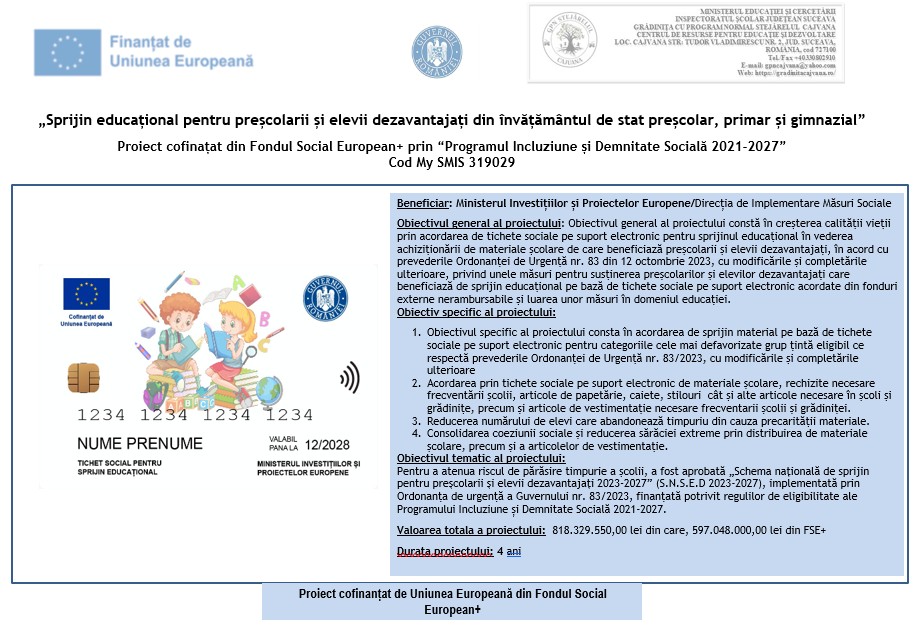 Obiectivul general al proiectului: Obiectivul general al proiectului constă în creșterea calității vieții prin acordarea de tichete sociale pe suport electronic pentru sprijinul educațional în vederea achiziționării de materiale școlare de care beneficiază preșcolarii și elevii dezavantajați, în acord cu prevederile Ordonanței de Urgență nr. 83 din 12 octombrie 2023, cu modificările și completările ulterioare, privind unele măsuri pentru susținerea preșcolarilor și elevilor dezavantajați care beneficiază de sprijin educațional pe bază de tichete sociale pe suport electronic acordate din fonduri externe nerambursabile și luarea unor măsuri în domeniul educației.